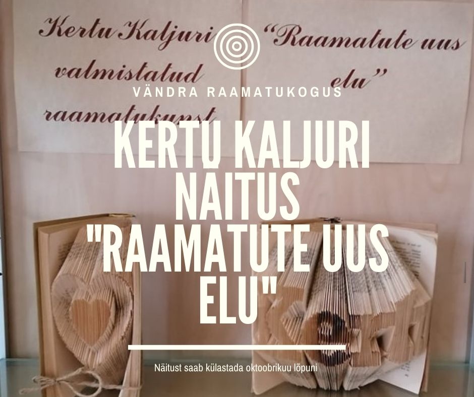 Oktoobrikuu lõpuni on Vändra raamatukogus avatud Kertu Kaljuri valmistatud raamatukunsti näitus. 20. oktoobril kell 12.00 saavad soovijad tulla raamatukunsti Vändra raamatukogusse ka õppima tulla